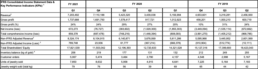 Non-IFRS Adjusted Revenue2 is a non-IFRS measure. The Company adjusts its revenue by adding back the value of jewelry that was returned by customers, and discounts given to customers. These adjustments are made to assess the gross revenue before deducting these items per IFRS revenue. The closest comparable IFRS measure is revenue.