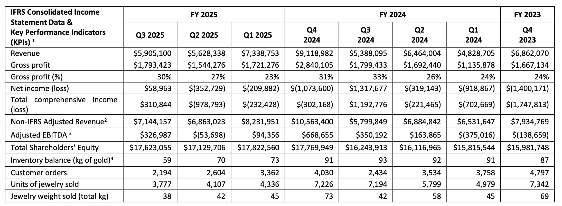 Non-IFRS Adjusted Revenue is a non-IFRS measure. The Company adjusts its revenue by adding back the value of jewelry that was returned by customers, revenue from orders not yet delivered, and discounts given to customers. These adjustments are made to assess the gross revenue before deducting these items per IFRS revenue. The closest comparable IFRS measure is revenue. Non-IFRS Adjusted Income (loss) is a non-IFRS measure. Non-IFRS Adjusted Income (Loss) is a non-IFRS measure, calculated as total comprehensive income (loss), excluding depreciation and amortization, stock-based compensation, accretion, loss on debt retirement, revaluation of metal loan, translation gain or loss, unrealized foreign exchange gains or losses and other non-recurring expenses. The closest comparable IFRS measure is total comprehensive income (loss).