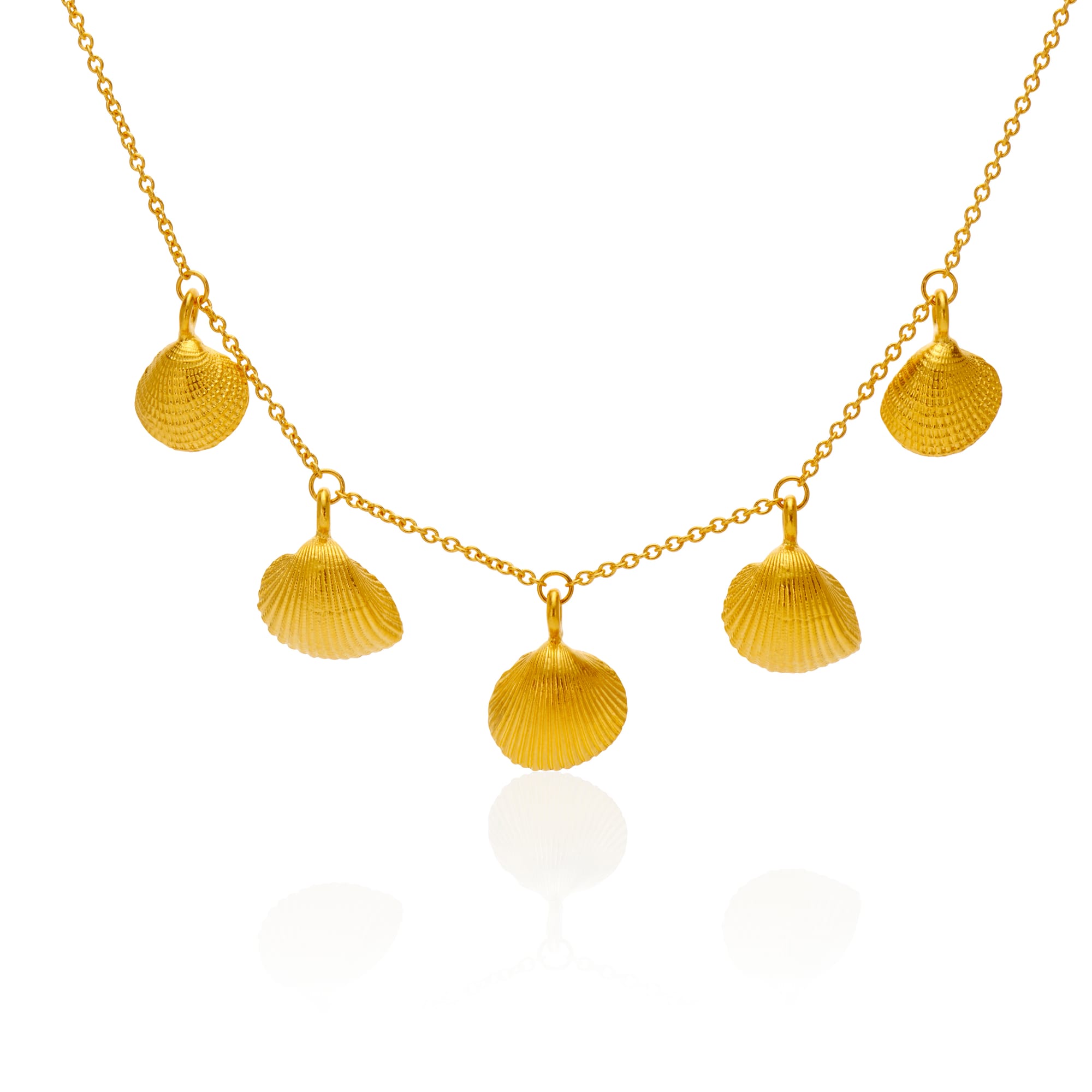 Each shell in the necklace is sculpted with fine ridged texture and cast in 24k gold, retaining the warmth and brilliance of the pure metal.